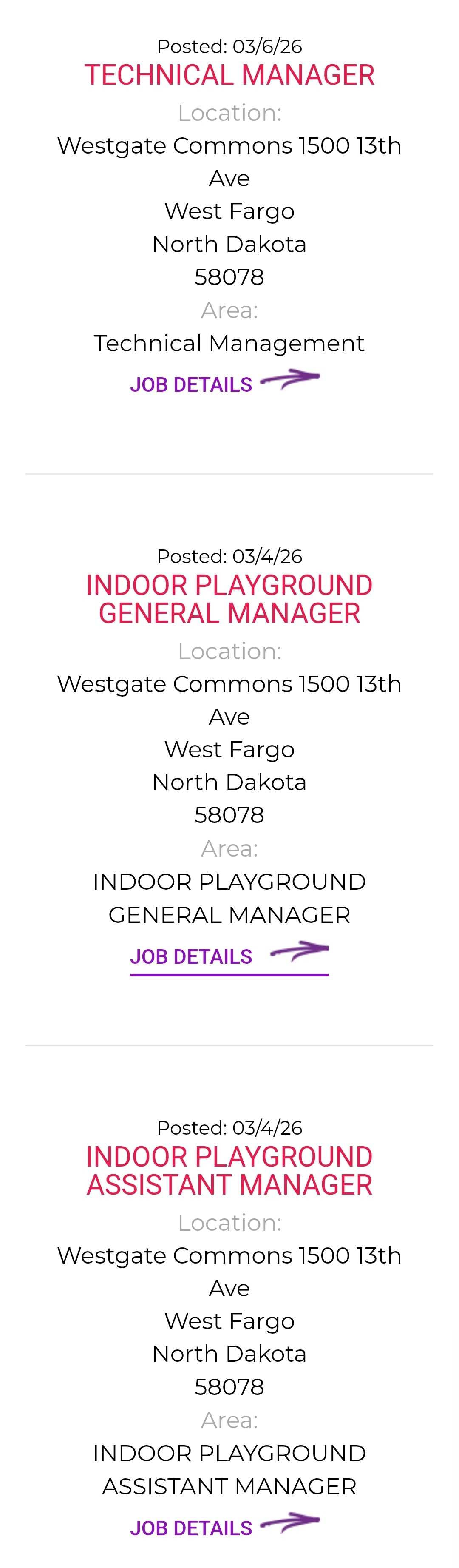 A set of job listings for an ‘indoor playground’ have been filed for West Fargo, ND (Westgate Commons, 1500 13th Ave E, Ste E). This is in the former David’s Bridal store. Sorry to anyone living here!