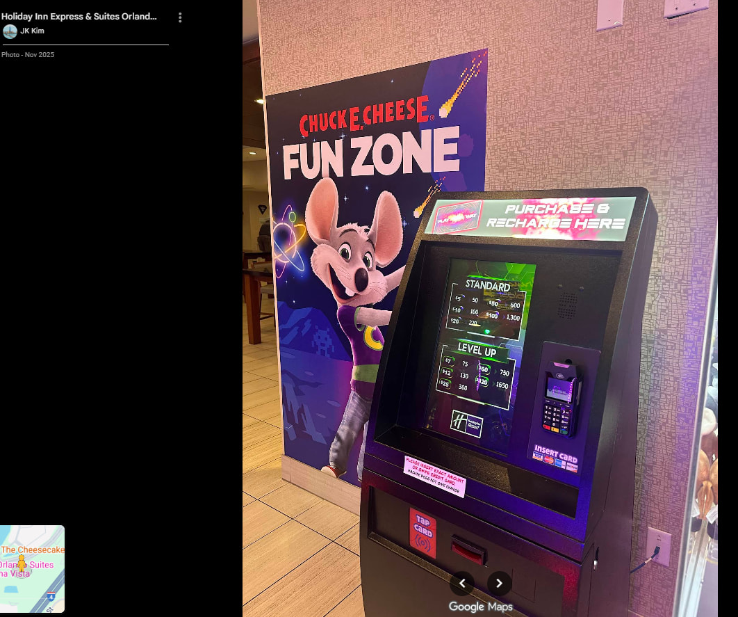 Another CEC Arcade has been discovered months after opening! This one is the Holiday Inn Express & Suite at Orlando, FL (11409 Marbella Palm Ct) with a Chuck E. Cheese Fun Zone, which does confirm that name is still in use for hotel specific use. Chuck’s Arcade is used for malls it seems.