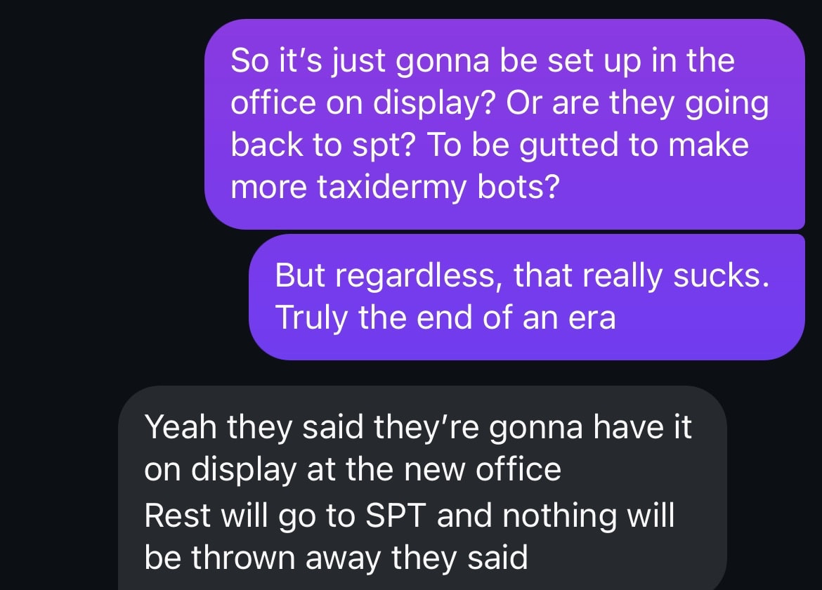 Man hurts that this bots who accompained the company since it was Showbiz Pizza Time Inc in 1986 now will be removed and being display or in SPT as “old stuffs” and most probably is that we never see again.