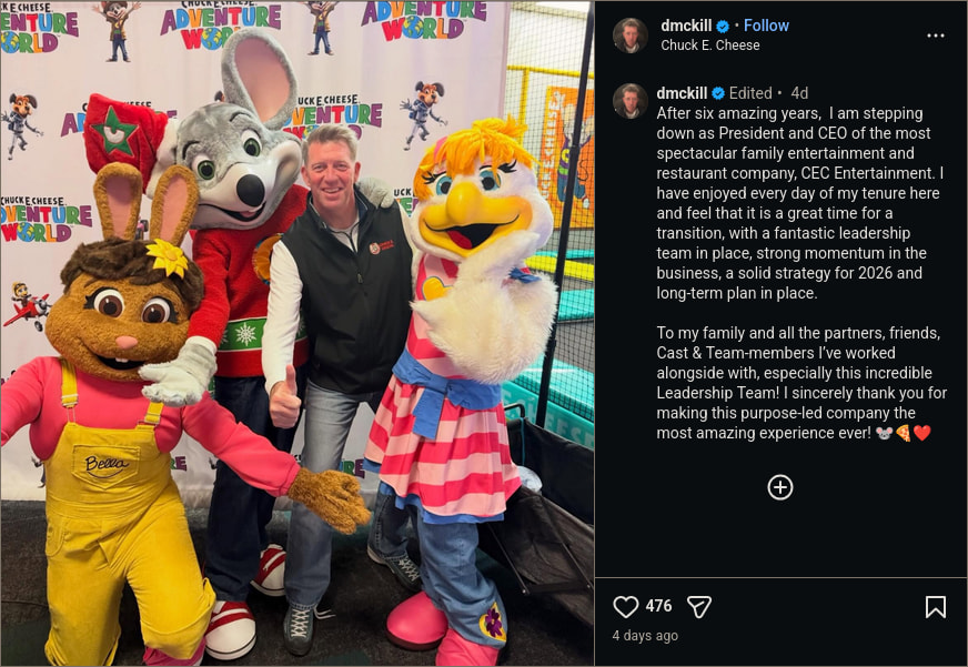 After six amazing years, I am stepping down as President and CEO of the most spectacular family entertainment and restaurant company, CEC Entertainment. I have enjoyed every day of my tenure here and feel that it is a great time for a transition, with a fantastic leadership team in place, strong momentum in the business, a solid strategy for 2026 and long-term plan in place.