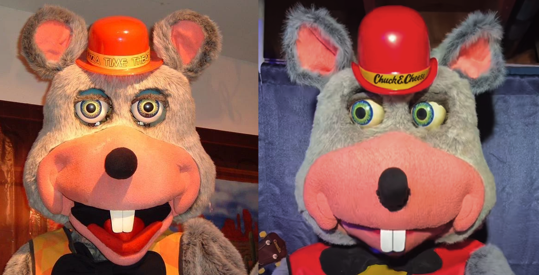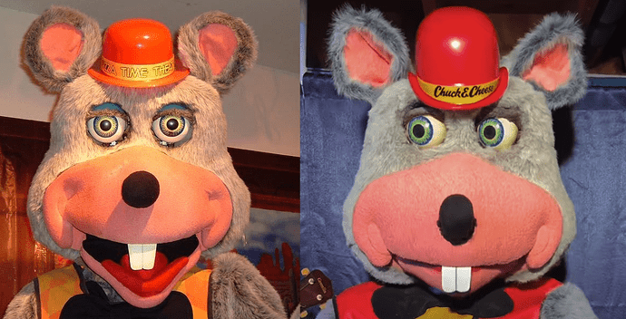 And as explained above, the jaw piece changed only very subtly. Though a few years later, the larger, red, theatrical lip would become less distinct. This is around the same time the brown vests were being swapped out for red vests to match the company logos and key art. Many locations also swapped the vests while keeping their original early masks, which can create some confusion.