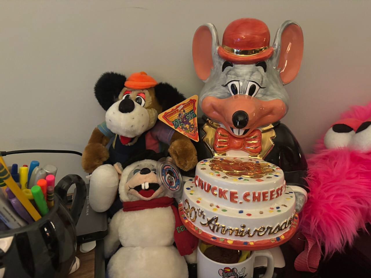 Here’s my collection: a Jasper plush, a Chuck E. snowman plush, a cookie jar, a mug, a few tokens, and a keychain!