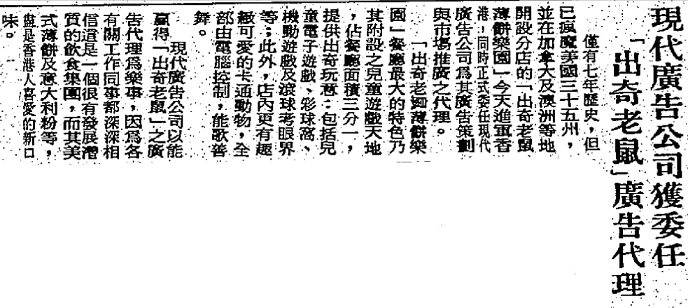 “Modern Advertising Company appointed as advertising agent for ‘Chuck E. Cheese’ Having only seven years of history, but already taking over 35 states in America, and having opened branches in Canada and Australia, ‘Chuck E. Cheese’ today officially enters Hong Kong. At the same time appointing Modern Advertising Company as its advertising planning and marketing representative. ‘Chuck E. Cheese’ is Hong Kong’s largest entertainment restaurant. Its attached children’s play area takes up one third of the total floor space. Including: motorised electronic games, ball pit room. All controlled by a computer, capable of singing and dancing. Winning the advertising agency of ‘Modern Advertising Company’, because all relevant staff have deep confidence in this pizza and food group, and its development of thin crust pizza and Italian noodles etc., are all new flavours beloved by Hong Kong people."