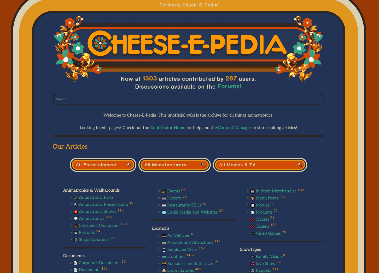 Stumbled across this forum and not sure what ‘Cheese-E-Pedia’ is about? We’re a massive animatronics wiki dedicated to archiving everything from Chuck E. Cheese, to ShowBiz Pizza, to Five Nights at Freddy’s, and all the little shows in between! Check out the main site here!