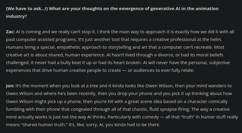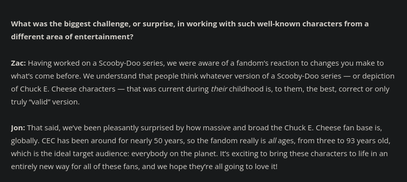 And also they comment on AI and give a much better take than literally anything from CEC Entertainment so far. Its kinda strange this month being at this juxtaposition of Adventure World’s apathetic marketing vs such a lovingly crafted animation piece by another company.